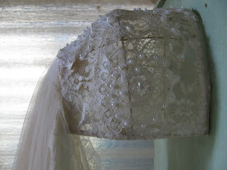*Veil, Vintage 1950s Bird Cage Lace Wedding Veil, Princess Katherine like Wedding English Wedding Veil, Beautiful, Perfect piece for your Victorian Wedding, Prop or Little Girl Dress up, Here Comes the Bride, Marriage, Bride and Groom, Retro Wedding VeilMeasure from the back of head piece 3 1/2 feet longThis piece is very pretty. The lace is white, veil part is an off white, tan. (see photo) note the discoloration on the inside of head piece. You can recover this with white ribbonThe head piece (bird cage) is adorned with pearls and sequence and lace. Email me with any questions. Oh, I stand 5 foot and it is maybe 6 feet long. Thanks for stopping by the ID Connection